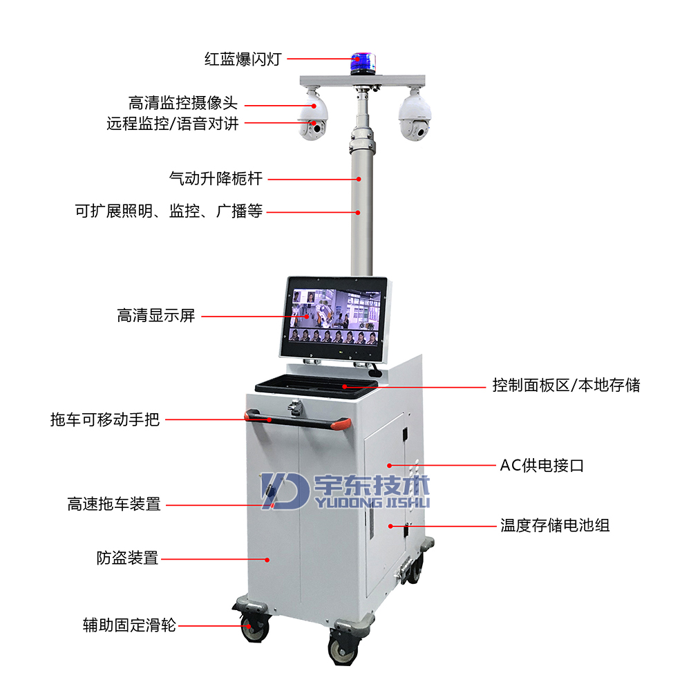 神盾X2 4G便攜式移動(dòng)監(jiān)控主要有攝像機(jī)、升降系統(tǒng)、傳輸系統(tǒng)、車體等4部分組成、安裝方便、操作簡單一體化設(shè)計(jì),機(jī)身靈活,帶有拖動(dòng)輪胎,便于布防和移動(dòng);一體式伸縮支架,方便固定;監(jiān)控桿體可升降、搭載高清360°旋轉(zhuǎn)的攝像頭;支持wifi/3G/4G無線網(wǎng)絡(luò)信號傳輸;自帶揭蓋式顯示屏,方便本地查看;內(nèi)置1組蓄電池,可續(xù)航24H(根據(jù)電池大小);定制化功能,支持人流管控、溫濕度監(jiān)控、揚(yáng)塵監(jiān)控等功能
